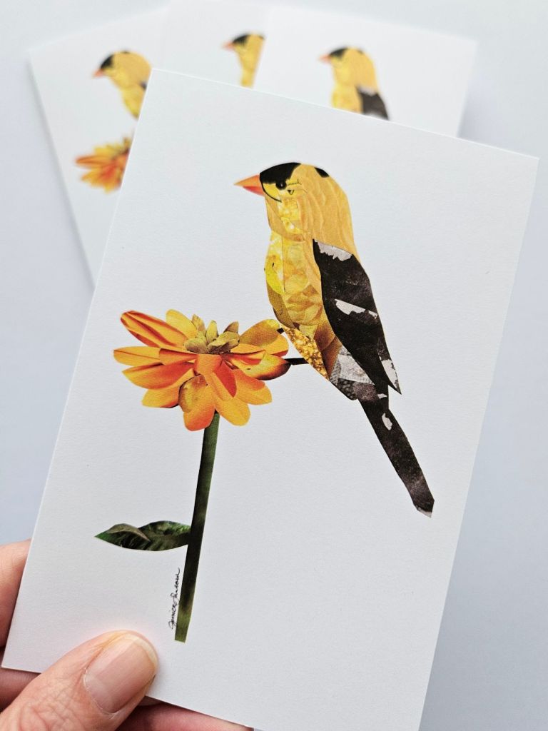 Goldfinch & Delight s available in packs of four 4×6 in. cards for $10, plus shipping. If you are interested in cards, feel free to let me know. I can take payment through Venmo or PayPal.