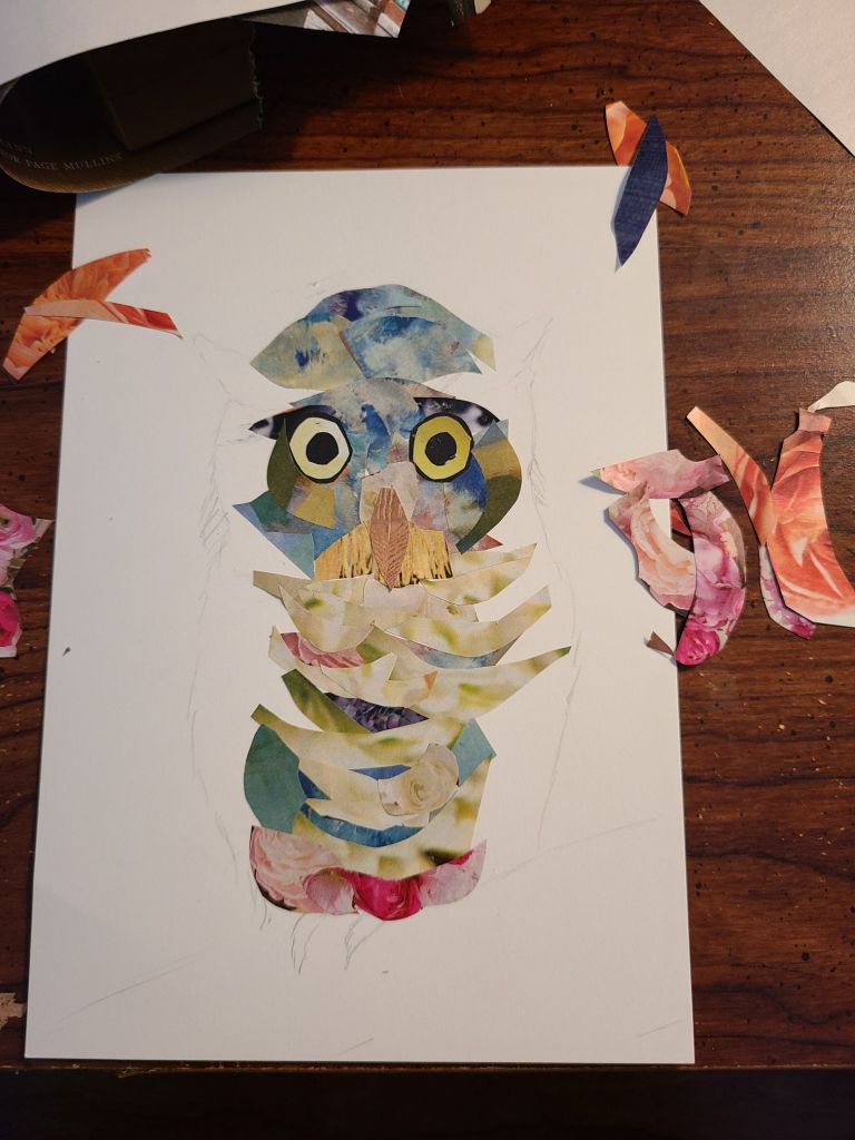 Part of my process for spending time with the owl was to make a collage. For me, collage is an act of remembering. I get to relive an important moment and engage it in a new way. When I collage, I feel like I am collaborating with Spirit. And I end up with a visual reminder, something to return to.